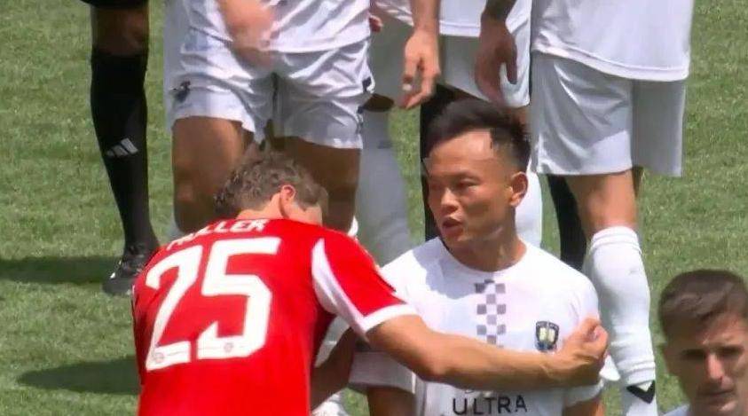 奥克兰城全队身价仅450万欧,对手本菲卡则达3.6亿欧,差距悬殊。周通此役担任中场,开场后便展现职业球员素养,多次回防拦截、前插逼抢。上半场末段,他在一次拼抢中头部遭撞击,队医紧急入场检查后示意换人,周通却激动地向场边挥手,嘴里喊着“我能踢”,甚至因拒绝下场与队医短暂争执,最终被教练组强制换下时,仍一脸不甘。