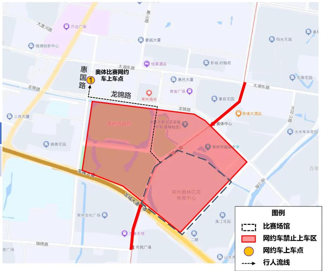 赛后网约车出行方案:20:45—21:45期间,核心管控区(含边框道路)以及晋陵路沿线(太湖路—龙城大道、龙锦路—锦绣路)设为网约车禁止上车区,网约车上车地点统一为常州万豪酒店(惠国路东侧)。