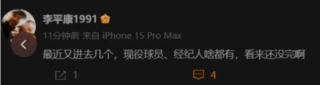 李平康在社交媒体上表示:“最近又进去几个,现役球员、经纪人少独有,看来还没有完啊。”李平康的曝料迅速上了热搜,很多球迷也让是关注进去的球员到底是谁。