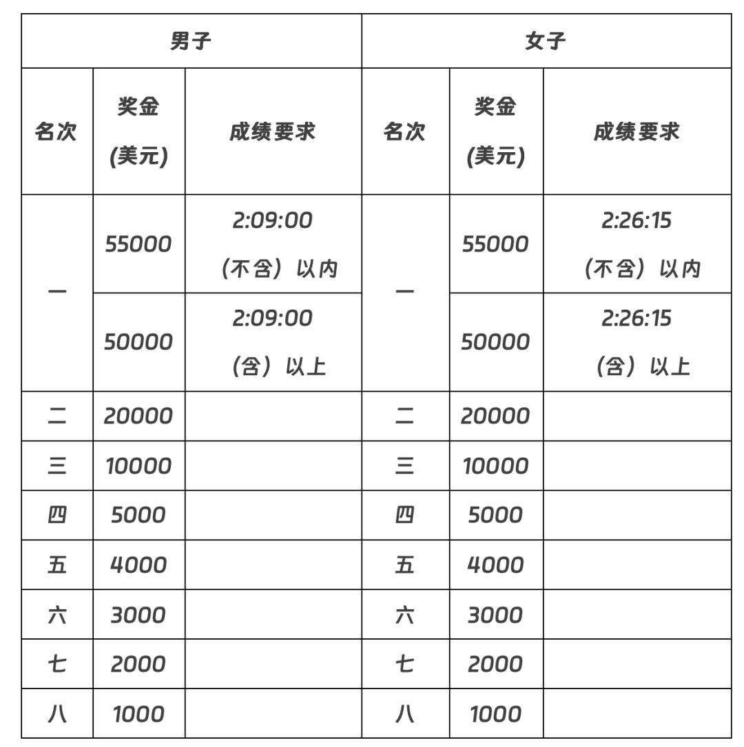 1、名次奖:根据枪声计时成绩,男、女分别录取前32名给予奖励。前8名奖金(单位:美元),9至32名奖金(单位:人民币),奖金的发放按照2025年世界田联的有关规定执行。