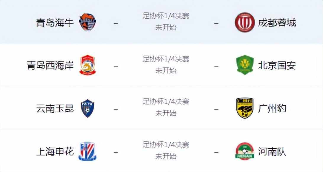 随着3场比赛结束,本届足协杯8强球队全部出炉,包括上海申花、青岛西海岸、河南队、成都蓉城、北京国安、青岛海牛、云南玉昆7支中超球队,以及广东广州豹1支中甲球队。1/4决赛中,上半区对阵为:青岛西海岸对阵北京国安,云南玉昆对阵广东广州豹;下半区对阵为:青岛海牛对阵成都蓉城,上海申花对阵河南队。4场对决将在一个月后上演。