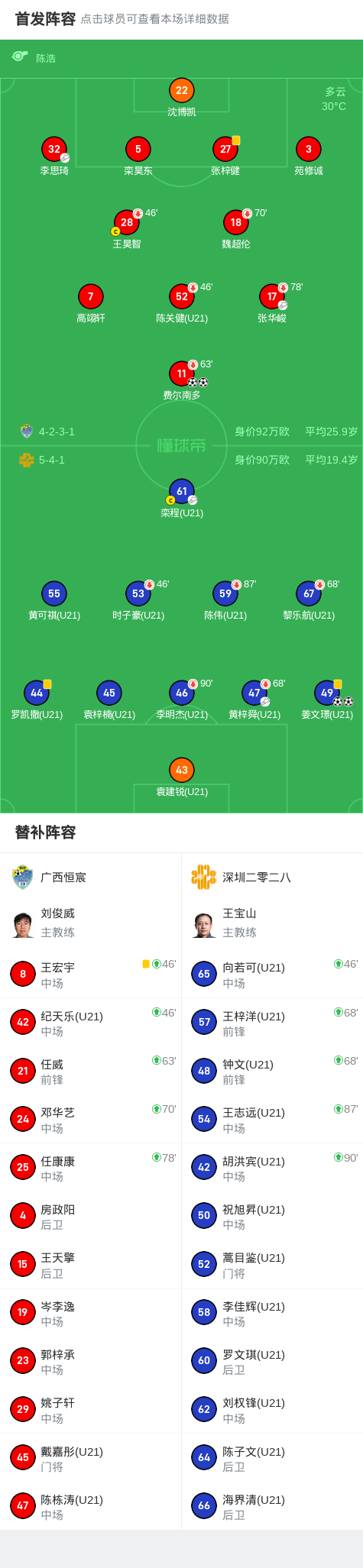 深圳二零二八客场2-2广西恒宸遭二连平,费尔南多、姜文璟双响
