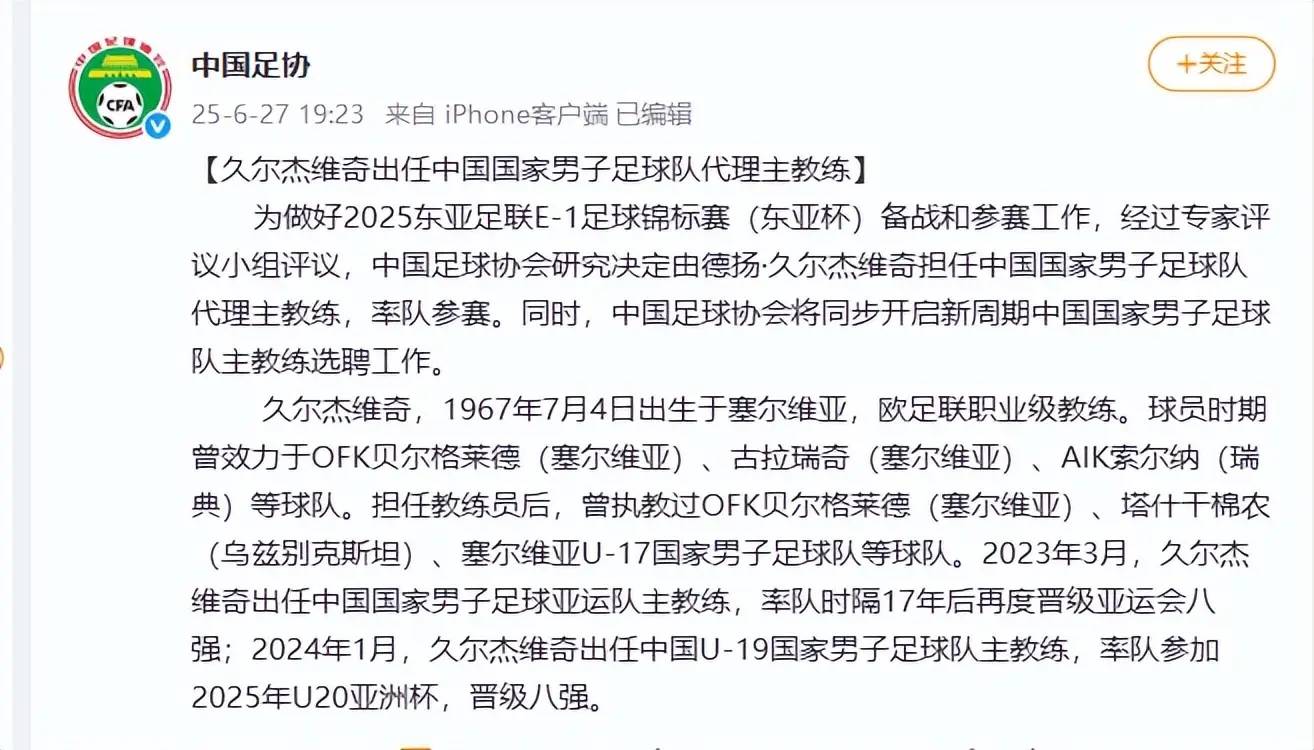 之后足协也官方宣布,久尔杰维奇出任国足代理主帅,将率队出征东亚杯。对于久尔杰维奇,国内球迷也比较熟悉,在年初在深圳举行的U20亚洲杯比赛中,他带领U20晋级八强。2023年他还带领国足全运队,时隔17年后晋级全运会八强。久尔的球员履历以及教练履历并不算出色,球员时期效力塞尔维亚贝尔格莱德等球队,退役后也曾执教贝尔格莱德和塞尔维亚U17。