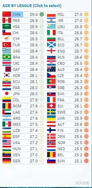全球前50个主流联赛平均年龄排名