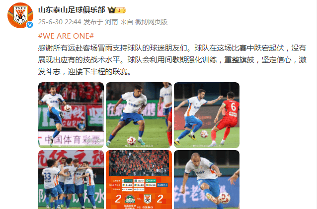 山东泰山队上半场2球领先依旧无法赢球,而且上下半场判若两队令人费解。比赛结束之后,深夜22点44分,山东泰山队也正式官宣发文,发文表示“感谢远赴客场冒雨支持球队的球迷,比赛跌宕起伏,没有展现出应有的技战术水平。间歇期强化训练,重整旗鼓,坚定信心,激发斗志,迎接下半程的联赛。”