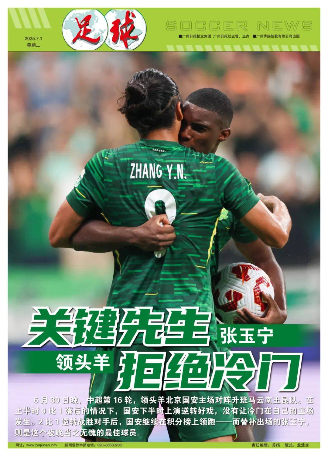 6月30日晚,在中超联赛第16轮的比赛中,国安队对阵升班马云南玉昆队,结果在上半时0比1落后的情况下,下半时上演逆转好戏,没有让冷门在自己的主场发生,2比1逆转战胜对手后,国安队继续在积分榜上领跑——而替补出场的张玉宁,则是这个夜晚当之无愧的最佳球员。