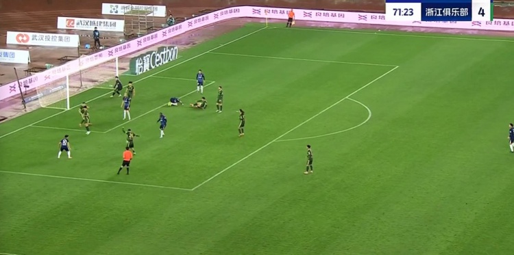 下半场补时8分钟。最终全场比赛结束,武汉三镇0-4浙江队。