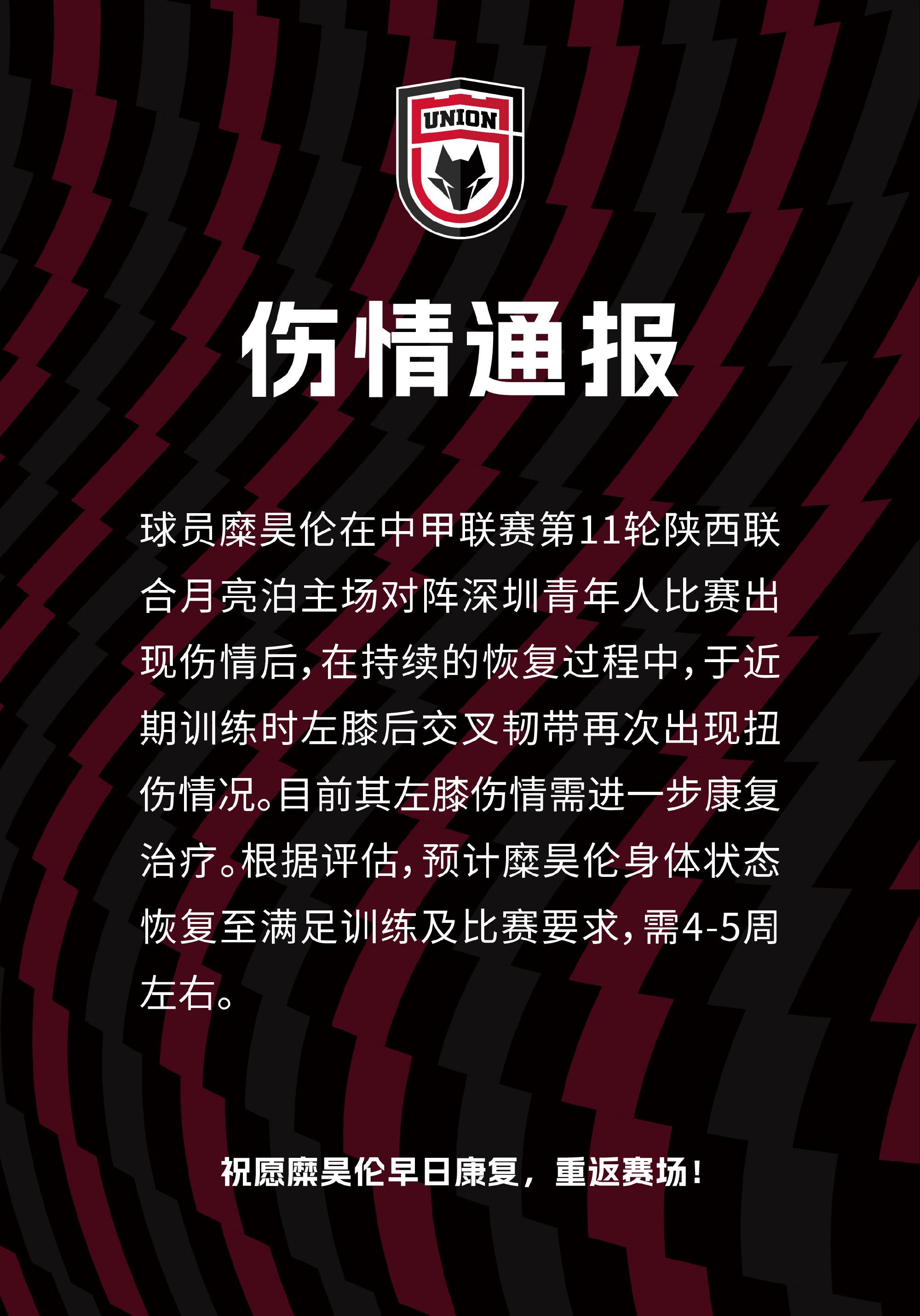 球员糜昊伦在中甲联赛第11轮陕西联合月亮泊主场对阵深圳青年人比赛出现伤情后,在持续的恢复过程中,于近期训练时左膝后交叉韧带再次出现扭伤情况。目前其左膝伤情需进一步康复治疗。根据评估,预计糜昊伦身体状态恢复至满足训练及比赛要求,需4-5周左右。