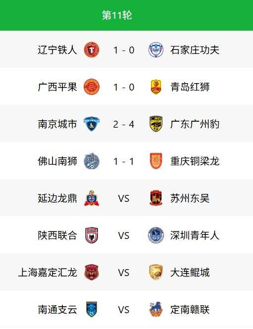 中甲:辽宁1-0功夫,广州豹4-2南京,铜梁龙1-1佛山,广西1-0青岛