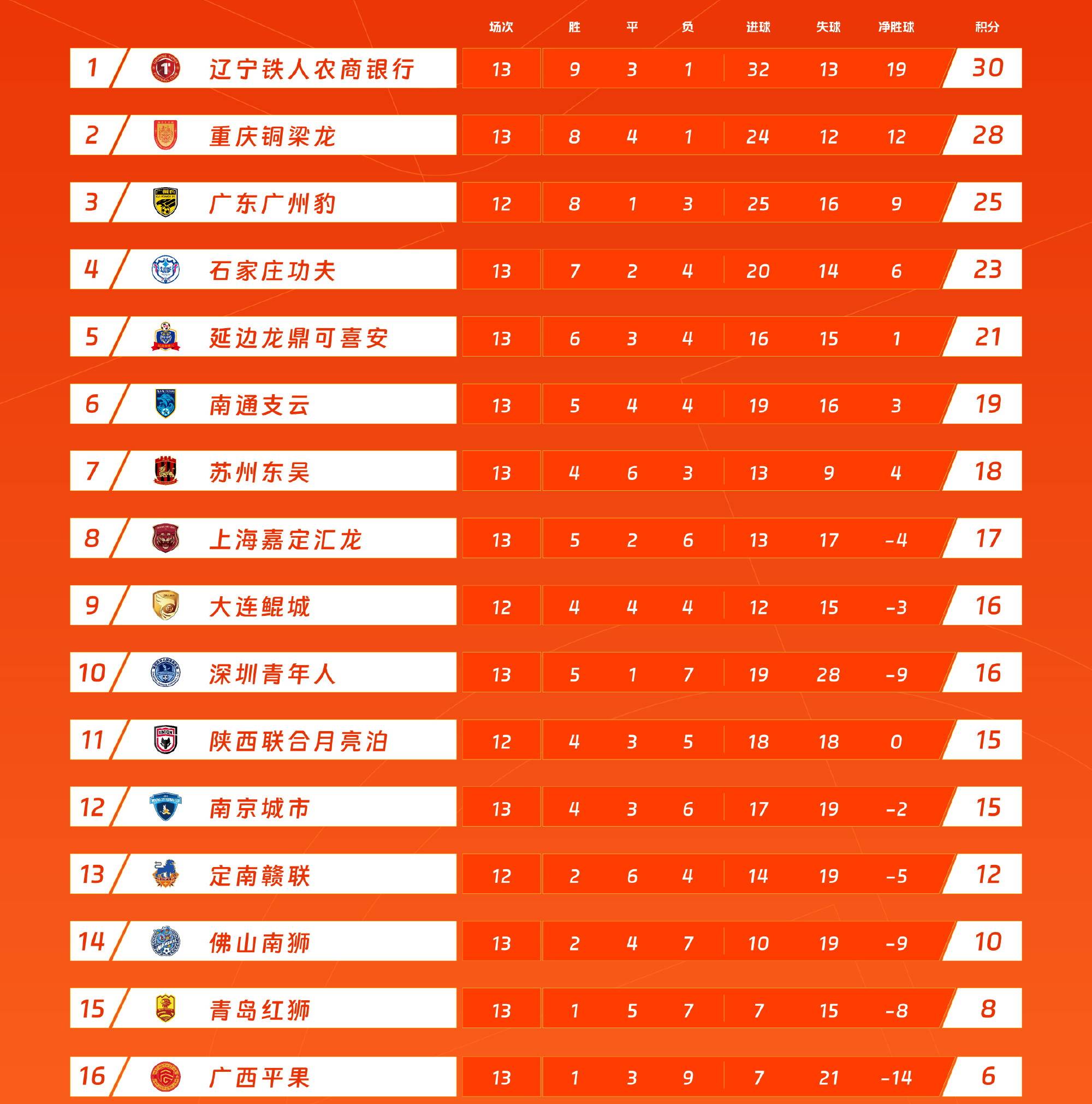 因为参加中国足协杯八分之一决赛,2025年中甲联赛第13轮有两场比赛延期进行,分别为大连鲲城主场对阵定南赣联和广东广州豹客场对阵陕西联合。本轮其他6场比赛已经结束,榜首两强再次没有获胜,中甲积分榜上,有5支球队排名发生变化。