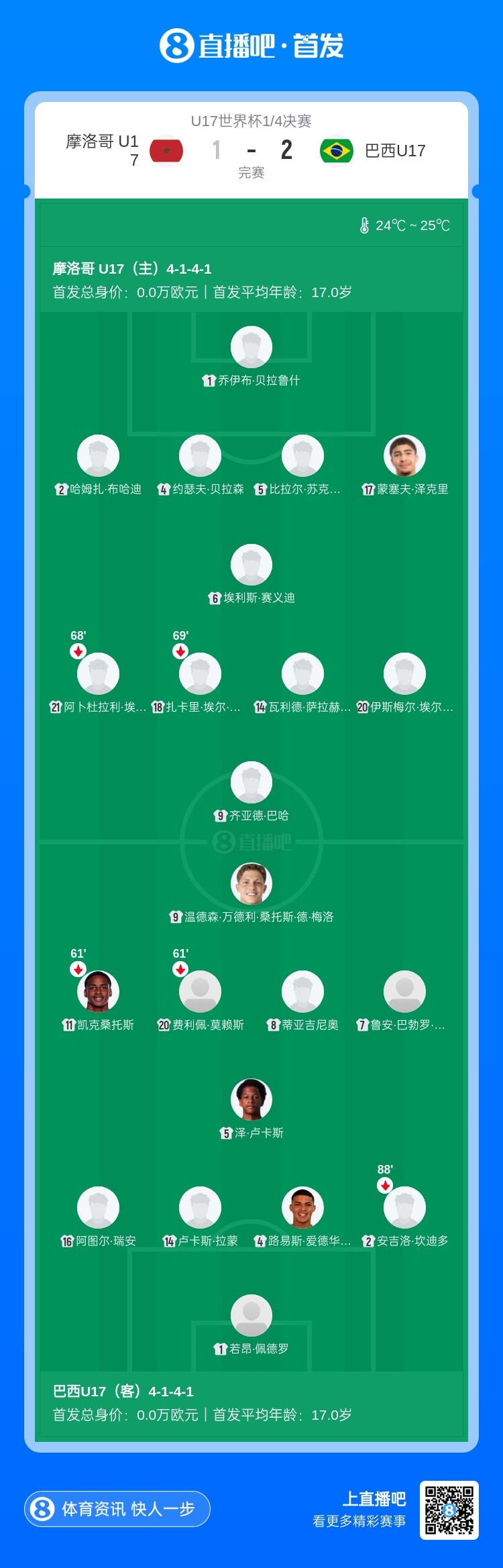 11月22日讯 北京时间23:45,U17世界杯1/4决赛摩洛哥U17vs巴西U17。上半场,巴西队率先取得领先,但半场补时阶段摩洛哥获得点球,巴哈点射扳平!下半场,补时阶段温德森·梅洛读秒绝杀!最终,巴西2-1击败摩洛哥,晋级U17世界杯4强!