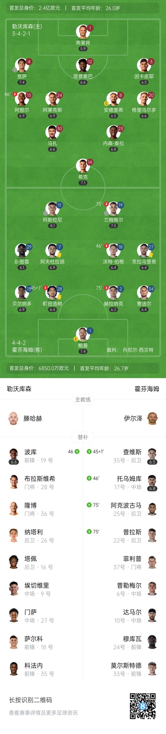 第51分钟,霍村反超比分!阿斯拉尼弧顶拿球回做兰姆佩尔跟上远射破门,勒沃库森1-2霍芬海姆。↓