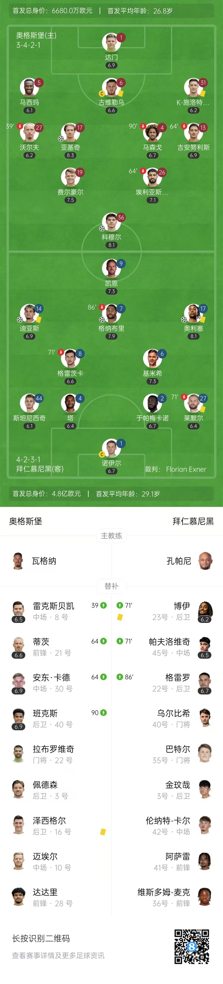 第48分钟,奥利塞禁区内连续晃动后闪出空档低射将球打进,拜仁慕尼黑3-0奥格斯堡。↓