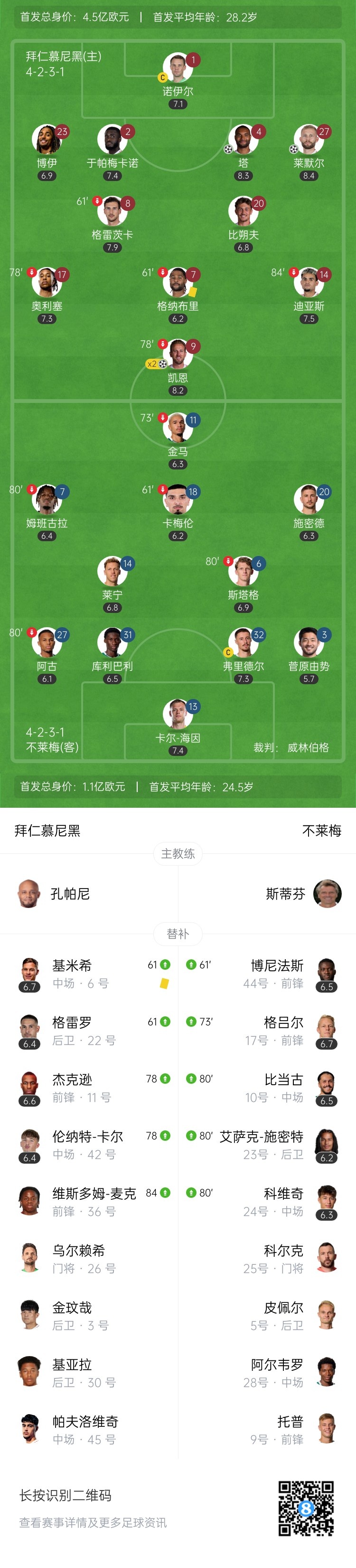 第45分钟,凯恩突破禁区内倒地,主裁判罚点球,凯恩亲自主罚命中,拜仁2-0领先↓