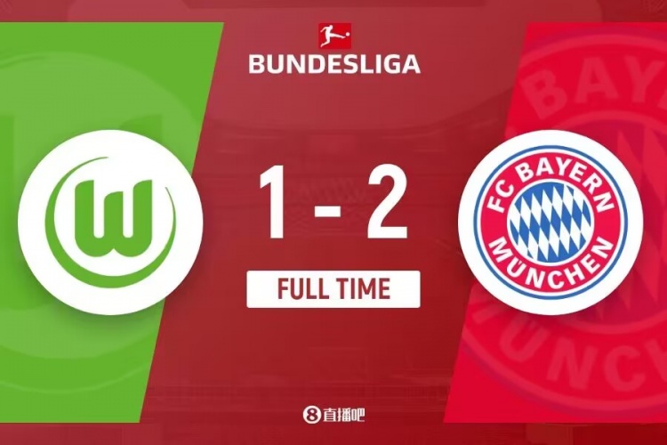 下半场伤停补时4分钟,全场比赛结束,拜仁2-1沃尔夫斯堡。
