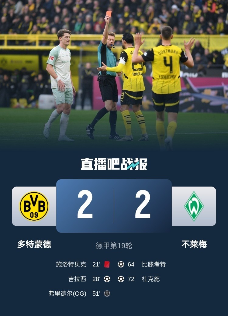 换帅首战止4连败!十人多特2-2不莱梅 施洛特贝克直红吉拉西造2球