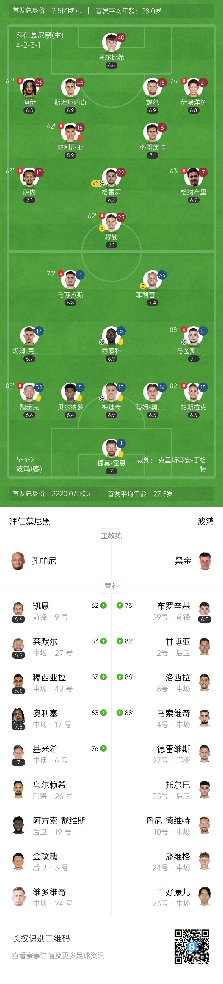 被连扳三球!十人拜仁2-3遭波鸿逆转 格纳布里失点帕利尼亚直红