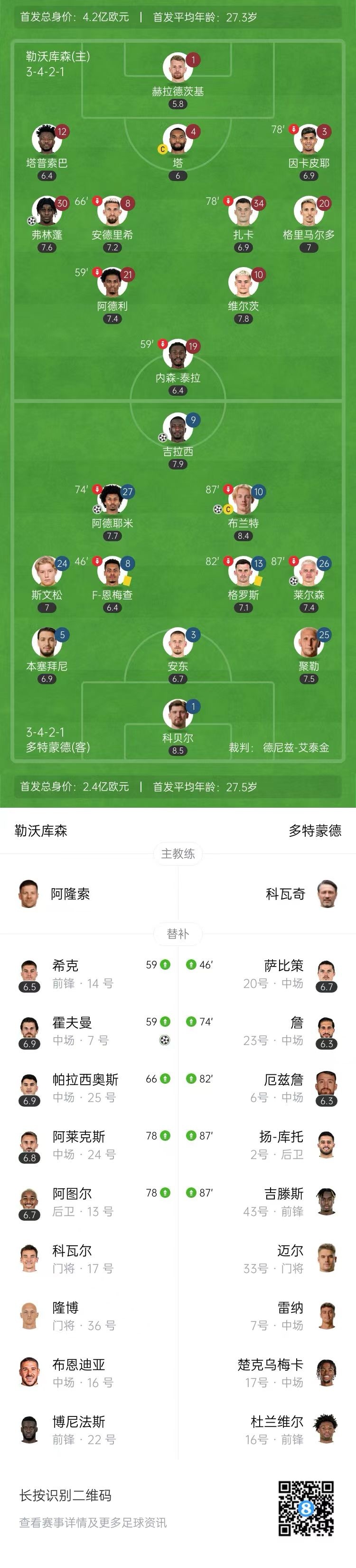 5月11日讯 北京时间5月11日21:30,德甲第33轮,勒沃库森坐镇主场拜耳竞技场迎战多特蒙德。上半场,弗林蓬兜射首开记录,布兰特包抄破门扳平,莱尔森反超比分,科贝尔屡次神扑。下半场,布兰特助攻阿德耶米单刀破门,吉拉西再下一城,霍夫曼头球扳回一球。全场比赛结束,多特蒙德客场4-2击败勒沃库森,取得联赛4连胜,距离排名第四的弗赖堡1分。