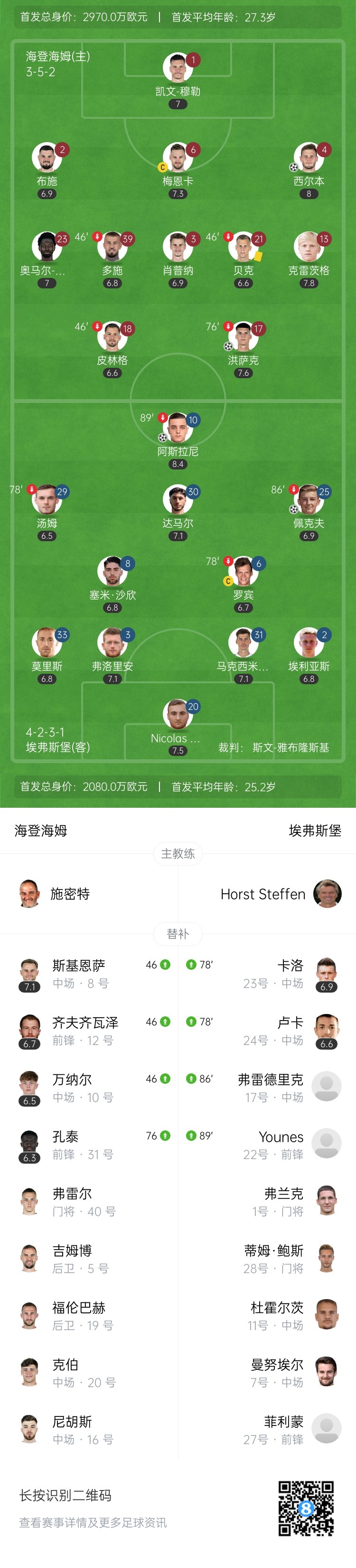 第65分钟,又是斯基恩萨禁区前远射被门将扑出,洪萨克补射破门!海登海姆连扳2球!2-2埃弗斯堡↓