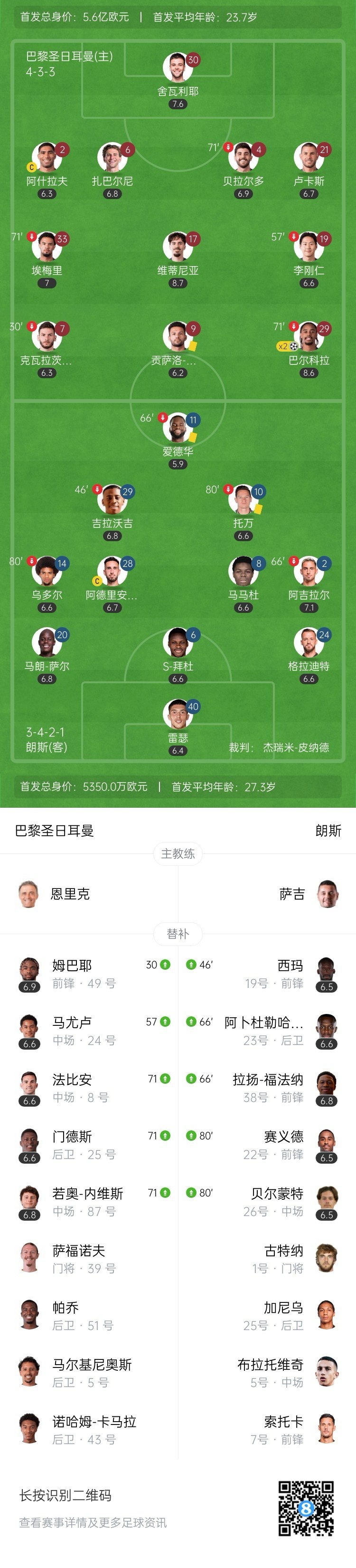全场比赛结束,巴黎圣日耳曼主场2-0战胜朗斯。