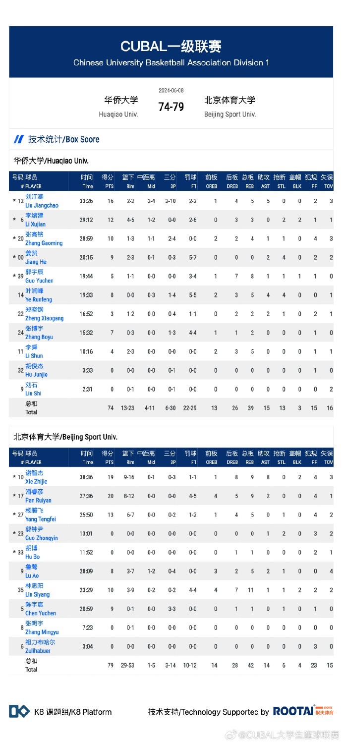 华侨大学:张高铭10分4篮板、李绪建12分3篮板、刘江潮16分5篮板5助攻、陈宇宸5分8篮板、叶润峰8分5篮板4助攻、张博宇7分。