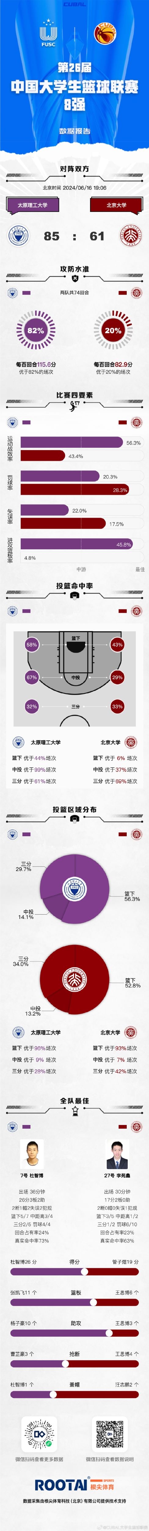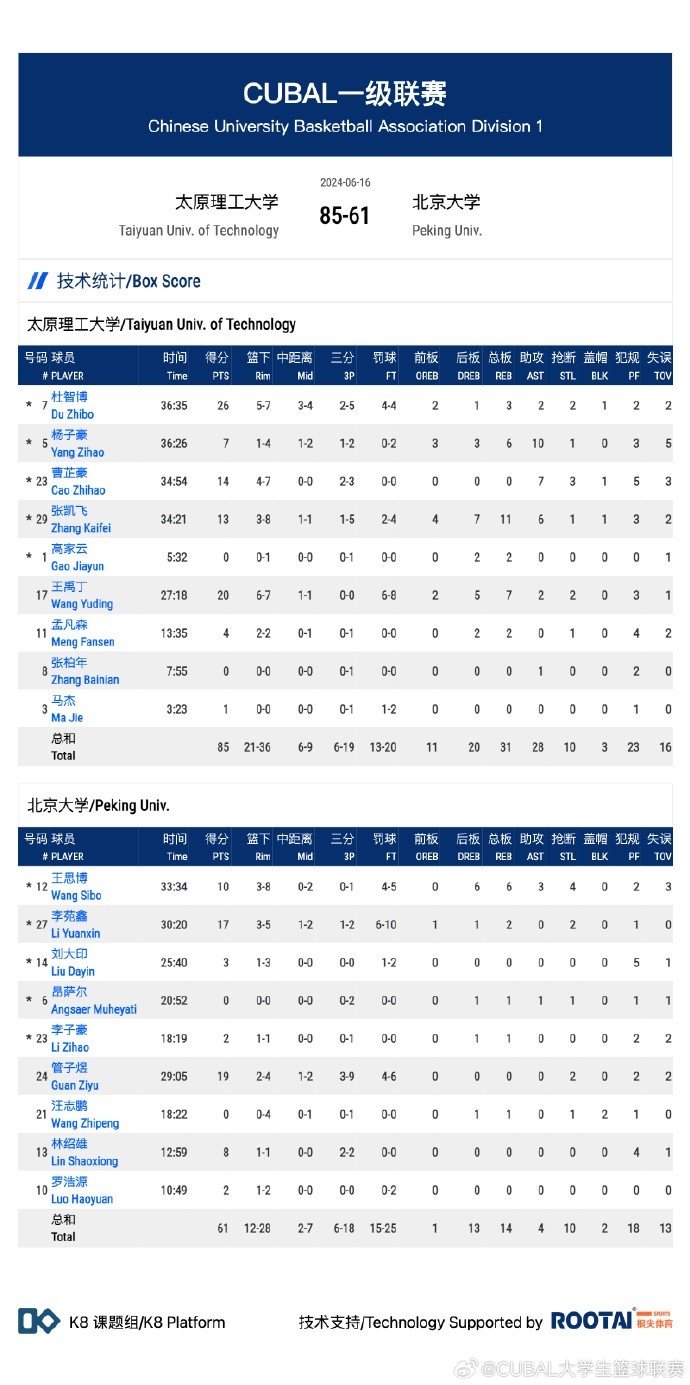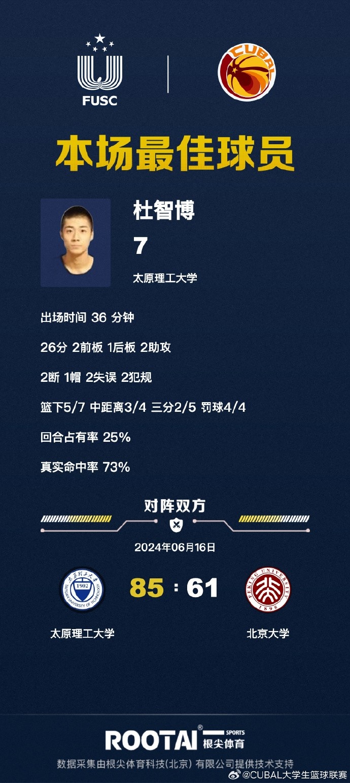 末节决战,北京大学进攻端继续断电,3分钟内没有得分,太原理工顺势拉开20分以上领先,管子煜关键三分紧急帮助北京大学止颓,孟凡森联手曹芷豪接连内线强打给出回应,太原理工牢牢掌握20分以上领先,王禹丁空切上篮后帮助太原理工领先到23分(双方总比分打平),李苑鑫关键三分止血,张凯飞三分还能回应,王思博两罚一中后杜智博空位三分绝杀北京大学(总比分反超1分),最终太原理工85-61复仇北京大学,总比分反超1分晋级全国4强!