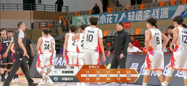 末节决战,双方都相继换上替补练兵,郝冠男联手杨佳丛有攻有传连续追分,天体职院一波10-2追分。打了半节张思雨终于止血,随后杨烁助攻加得分帮助天体职院继续追分,但中国石大还是牢牢掌握住二十几分领先,最终中国石大90-65轻取天体职院,拿到开门红。
