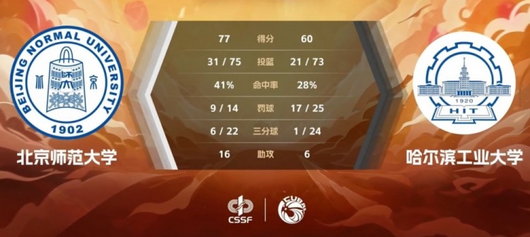 末节决战,双方上来又是连续打铁,邵振恒连攻加传帮助北京师大牢牢掌握住十几分领先。江龙接连打成二次进攻止血,但肖洋三分被犯规后三罚全中再回应,随后肖洋里突外投再连得6分杀死比赛,最终北京师大77-60战胜哈工大。
