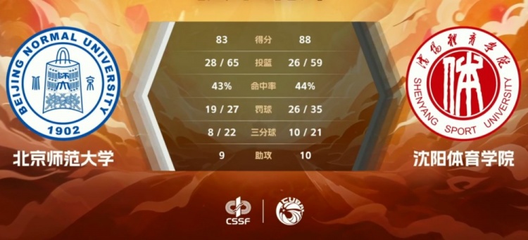 末节开局双方失误不断,李杰一直保持着不错的状态并在开局连续拿分为沈阳体院守住优势;北京师大则不断冲击篮下抢分,双方交替得分分差一直都不大,北京师大多次追至一球差距但始终无法扭转局势,毕洪贺最后制造犯规两罚全中拉开3分领先,北京师大则在最后时刻出现失误错失机会。最终,沈阳体育学院力克北京师范大学拿下比赛。