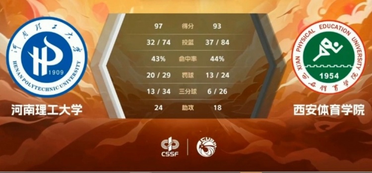 第一个加时中张恒一度帮助西安体院取得领先,许天佑三分止血,随后河南理工追平比分拖入第二个加时。第二个加时中廉岳琪再度挺身而出帮助河南理工建立优势,虽然程勃轩投进高难度三分续命,但最终河南理工大学经过双加时97-93艰难拿下西安体育学院。