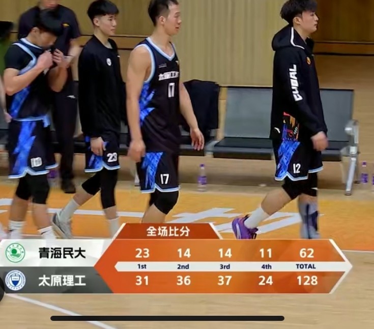 末节决战,由于分差过大比赛已无悬念。夕热扎西抢断反击先拿2分,但太原理工进攻端还是稳扎稳打,杜智博三分再中一波9-2拉开近60分分差。太原理工连续外线扔三分,杨子豪接连三分继续拉开到60分以上分差,最终太原理工128-62大胜青海民大。