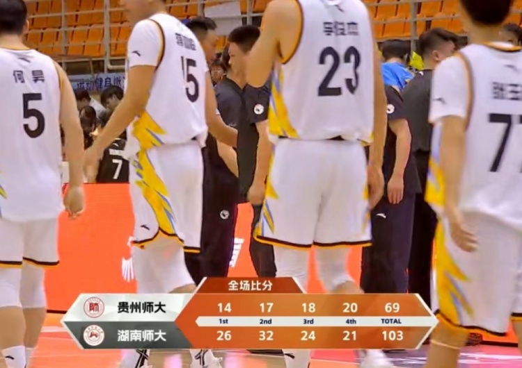 末节决战,谢东燃三分还能命中追分,李一辰和葛伟国连续进攻篮板,葛伟国补篮加上钟子强三分强势回应,李治翰连砍4分拉开近40分领先,田茂雄三分再次止血,但湖南大学总能回应保持住近40分领先,最终湖南师大103-69大胜贵州师大。