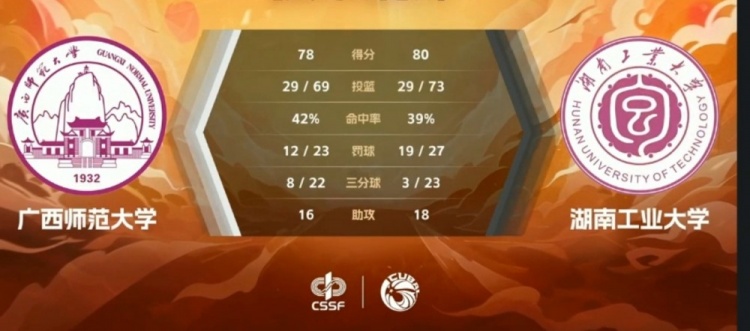 末节决战,两队上来都是连续进攻不中,这节打了3分钟时间才由黄烨投进三分打破得分荒,广西师大也追平比分。此后两队进攻效率依旧不高,湖南工大通过多次制造罚球再度取得微弱优势,广西师大关键罚球连续罚丢,湖南工大则是罚球稳健将比赛拿下,最终湖南工业大学80-78险胜广西师范大学。