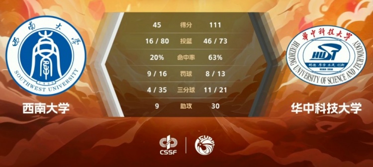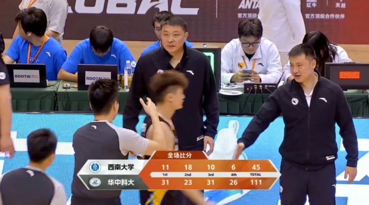 末节华中科大状态依旧神勇,申瑾文开场不久便命中三分,西南大学则连续尝试远投依旧打铁。巨大分差之下比赛也早早进入练兵,华中科大开局不久人员更换,双方也以练兵形式打完剩余时间。最终,华中科技大学111-45大胜西南大学杀入半决赛。