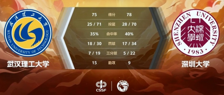 末节决胜深圳大学主抓防守降节奏,他们5分钟里仅丢4分牢守领先优势,但深圳大学自身进攻也不算好埋下隐患。末段深圳大学彻底哑火,而武汉理工以王鹏翼的三分和付典钦的2+1为主送上一波12-0的攻势直接抹平比分看到希望。不过决胜时刻肖正杰连投带罚拿下关键3分为球队重新取得领先奠定胜局。最终,深圳大学力克武汉理工大学拿下比赛。