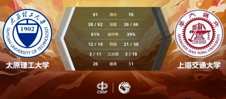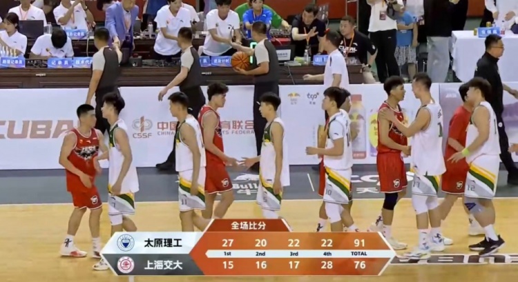 末节太原理工开始降节奏控比赛节奏,他们3分钟里仅丢3分不给对手任何起势机会。节中上海交大凭借顿家威的连续拿分破荒,但防守端阻止不了对手导致分差高居不下,曹芷豪得分助攻一把抓帮助太原理工做出应对。末段上海交大虽然疯狂夹抢缩小至10分附近但为时已晚。最终,太原理工大学91-76轻取上海交通大学拿下八强开门红。