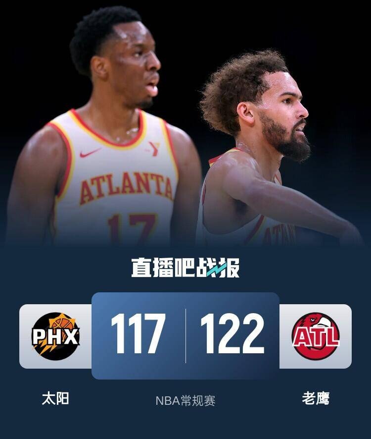 老鹰(20-19):特雷-杨43分5助攻3断3篮板,奥孔武22分21篮板,马修斯19分3篮板,克雷伊奇15分6助攻5篮板2断,里萨谢2分4篮板,卡佩拉3分8篮板,丹尼尔斯9分4篮板3助攻3断,博格丹9分。