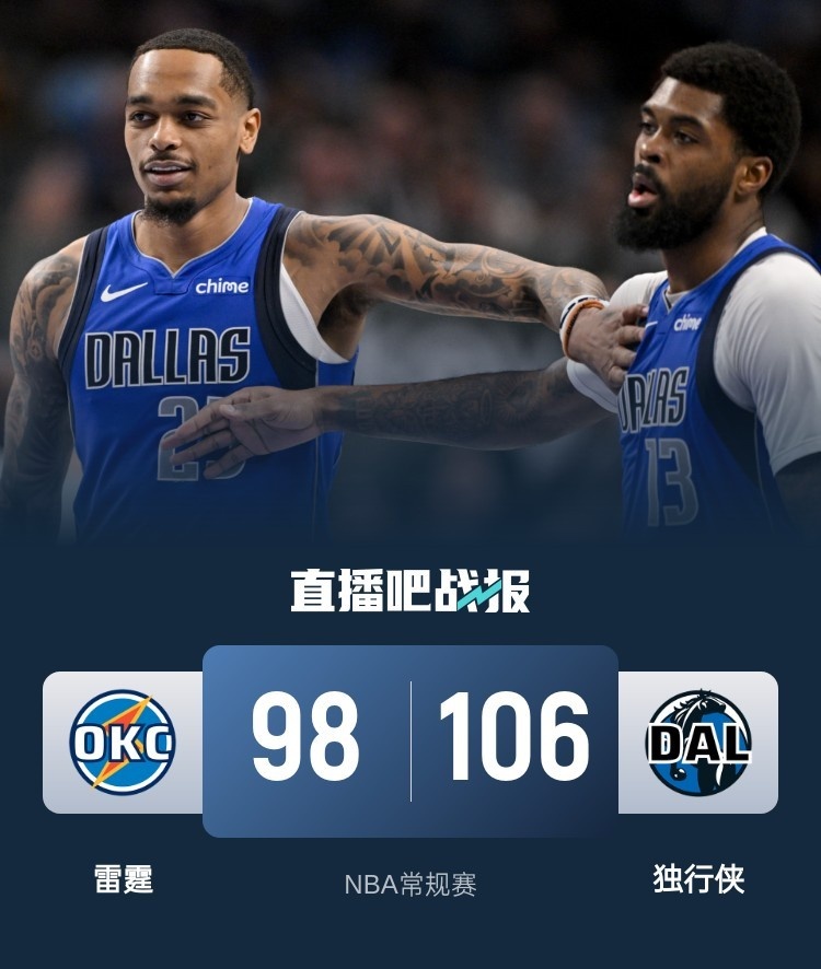 比赛开始,独行侠上来就10-0捍卫主场,打了4分钟雷霆才拿到首分,随后又打出11-1直接追平,末段雷霆连续3记三分首节反超4分,次节双方展开拉锯战,哈迪受伤离场,最后4分钟雷霆进攻端突然断电,独行侠外线接连3记三分,欧文带队19-2超级攻击波直接领先到20分。下半场,独行侠也陷入得分荒,打了7分多钟仅得4分,阿隆-维金斯联手杰林威连中4记三分,雷霆顺势31-9超级进攻波一度反超比分,丁威迪2+1还保持1分领先,末节独行侠6-0稳住局势,但雷霆迅速回应7-0,比赛进入白热化,关键时刻丁威迪接连两记三分拉开两球以上领先,最终独行侠106-98力克雷霆,终止3连败同时终结对手4连胜。
