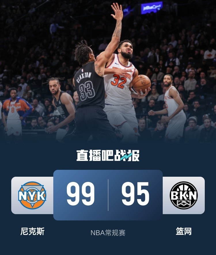 比赛开始,尼克斯首发五虎上来就发力打出15-5开局,但篮网马上回应15-4进攻高潮一度反超比分,首节篮网能领先2分,次节麦克布莱德联手阿丘瓦带队打出12-2攻击波再建立主动权,拉塞尔有攻有传助队追分,唐斯补篮2+1助尼克斯半场领先8分。下半场,篮网继续追分,但无奈自身连续失误,尼克斯打成反击一波8-0再次领先到双位数,随后双方展开拉锯战,尼克斯三节还领先9分,末节尼克斯突然断电,打了8分钟仅得3分,篮网一波13-3直接反超比分,但随后布伦森里突外投连砍6分稳住局势,拉塞尔三分续命但卡梅隆-约翰逊反超三分不中,最终尼克斯99-95险胜篮网,送对手4连败。