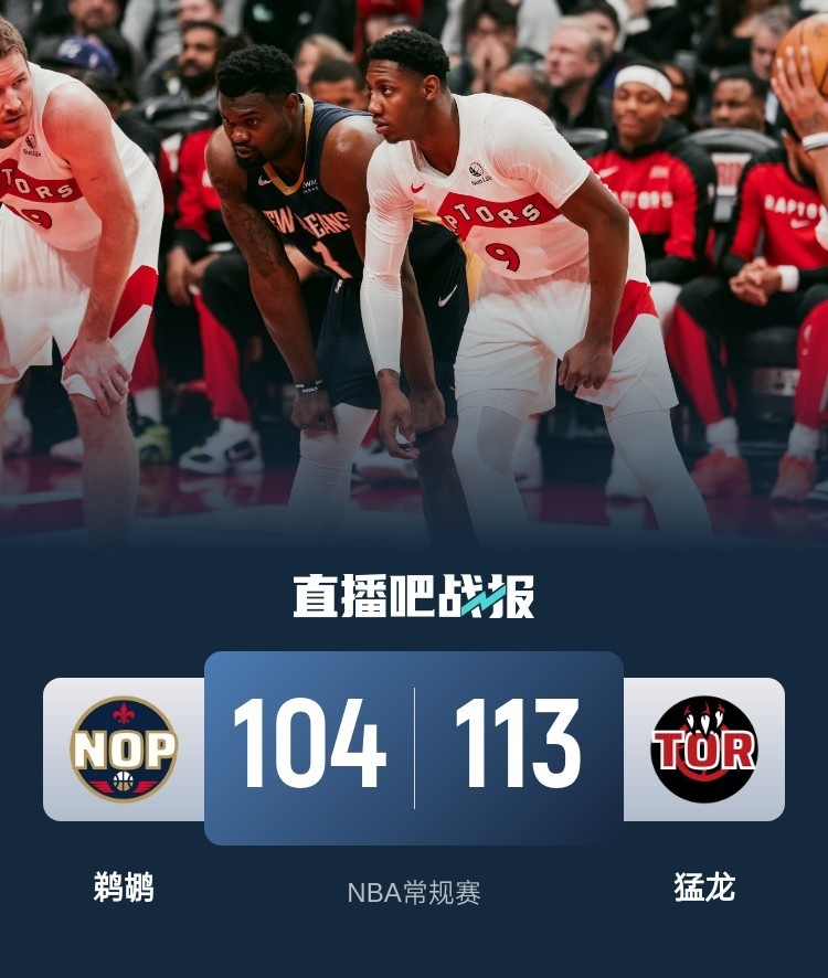 首节开打后双方互相试探,猛龙多点开花逐渐占优,锡安联手麦科勒姆及时回应,首节结束时猛龙领先5分,次节回来,锡安接连取分率队缩小分差,但猛龙延续火力,末段再度发力拉开比分,半场战罢,猛龙确立16分优势。易边再战后穆雷和麦科勒姆轮番打进,墨菲外线续上火力,鹈鹕连续轰出得分高潮一举反超,三节结束后鹈鹕反超1分,末节决战,鹈鹕进攻突然断电,猛龙轰出12-3攻击波确立优势,鹈鹕追分无望,最终猛龙113-104力克对手终结3连败,同时送给鹈鹕3连败。