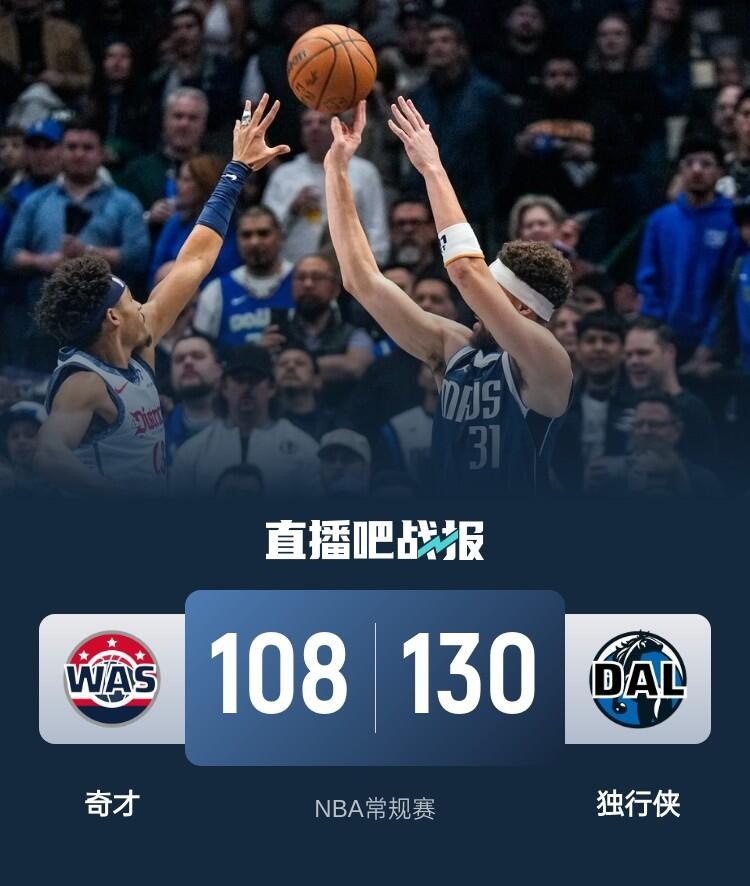 开场后奇才表现差劲,独行侠以13-2开局,克莱手感火热首节轰进7记三分,独行侠单节42-16遥遥领先。第二节奇才虽然进攻找回些状态,但防守端表现依旧差劲,独行侠多点开花继续扩大领先,华盛顿和加福德在内线也是予取予求。易边再战,两队依旧打得大开大合,普尔和库利巴利帮助球队追回一些分数。最后一节两队都是派出替补练兵,奇才也未能继续缩小分差,最终独行侠130-108大胜送给奇才14连胜。
