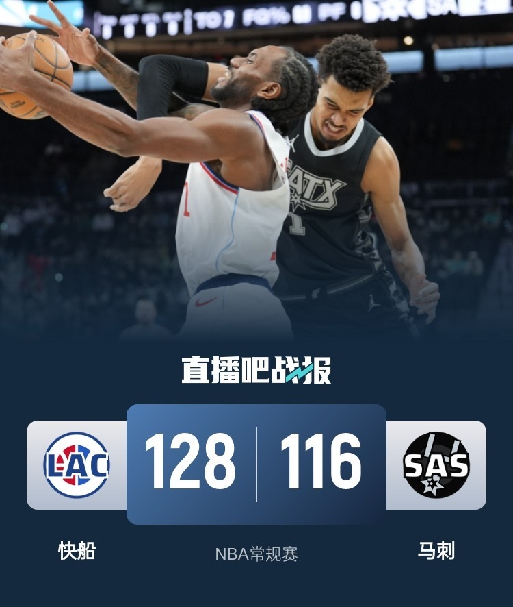 比赛开始,双方开场势均力敌,比分交替领先,哈登穿针引线,次节双方继续缠斗,快船连投带罚拿分,马刺多点开花给出回应,快船持续发力获得两位数优势,马刺里突外投还以颜色,半场战罢快船65-60领先马刺。易边再战,鲍威尔和祖巴茨联手发力一度将优势扩大到16分,马刺轰出23-6强势反超,末节双方陷入缠斗,文班三分咬住,此后快船轰出22-5直接杀死比赛。最终,快船力克马刺,客场过关。