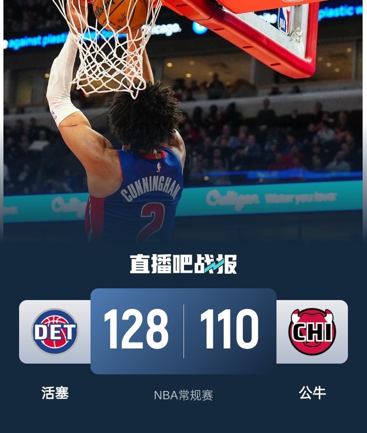 🏀康宁汉姆29+7 奥萨尔19+7 武器22+13 活塞轻取公牛迎4连胜