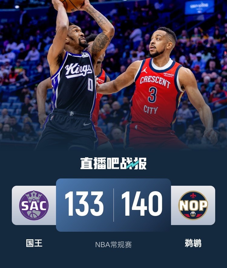 2月14日讯 NBA常规赛,国王对阵鹈鹕,国王最近打得不错取得3连胜,鹈鹕则是10连败在西部垫底,本场比赛锡安缺阵。