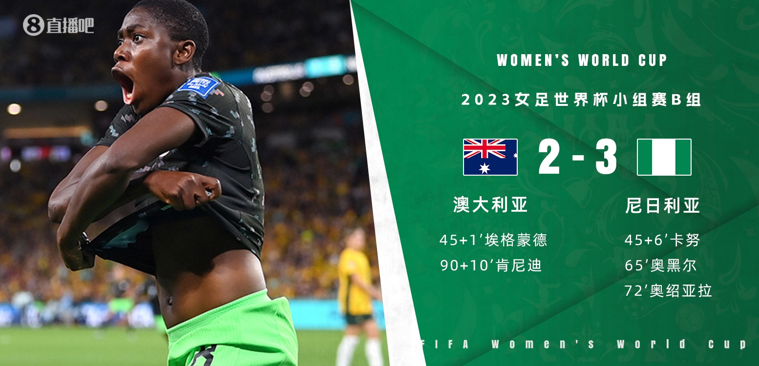 7月27日讯 北京时间7月27日18:00,女足世界杯小组赛B组第2轮,澳大利亚女足对阵尼日利亚女足。上半场埃米莉-范埃格蒙德补时破门,乌钦娜-卡努扳平比分,澳大利亚女足暂1-1尼日利亚女足;下半场奥西纳奇-奥黑尔头球建功,奥绍亚拉再下一城,阿兰娜-肯尼迪补时头球破门,最终尼日利亚女足3-2逆转澳大利亚女足,积4分上升到小组第一位,澳大利亚女足积3分掉落至第三位。