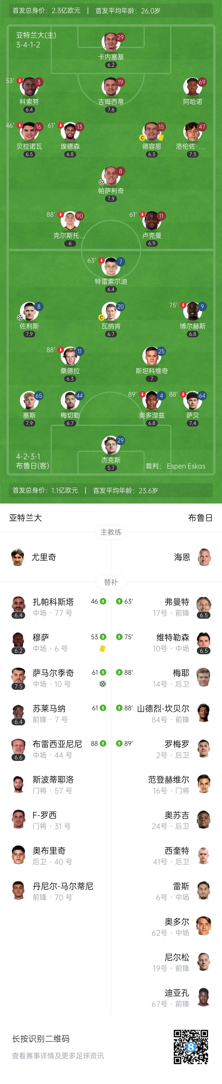 第87分钟,亚特兰大左路传中,穆萨头球一蹭助攻,帕萨利奇接力破门!亚特兰大2-1反超布鲁日↓