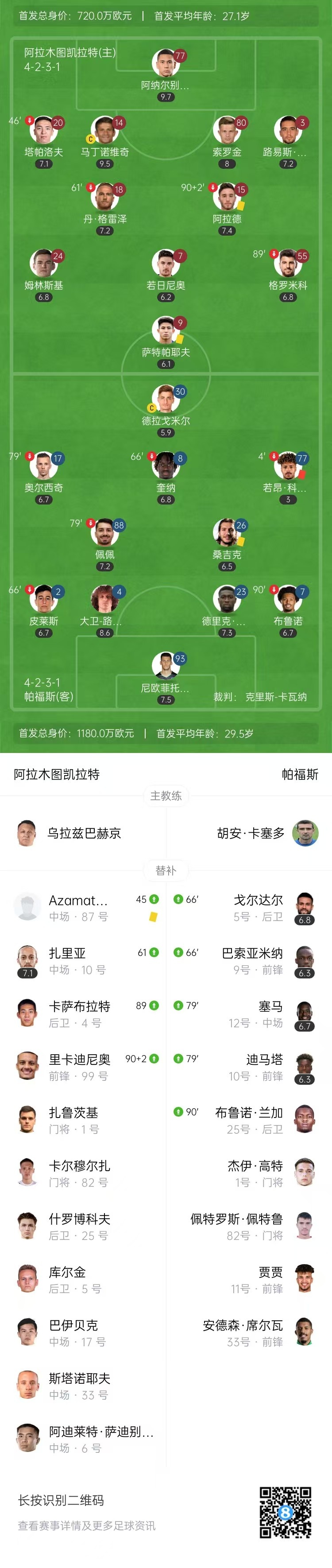 全场比赛结束,阿拉木图凯拉特0-0帕福斯。