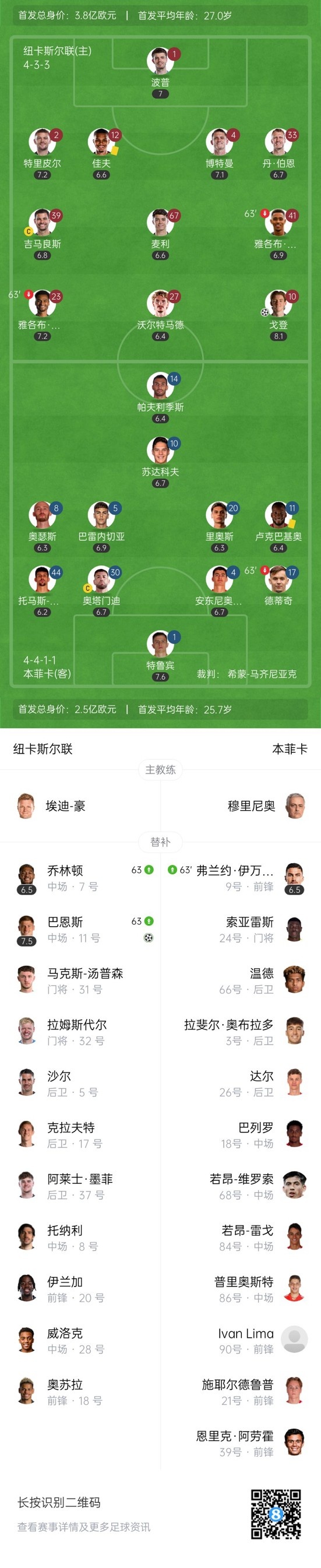 下半场补时2分钟,纽卡3-0本菲卡。