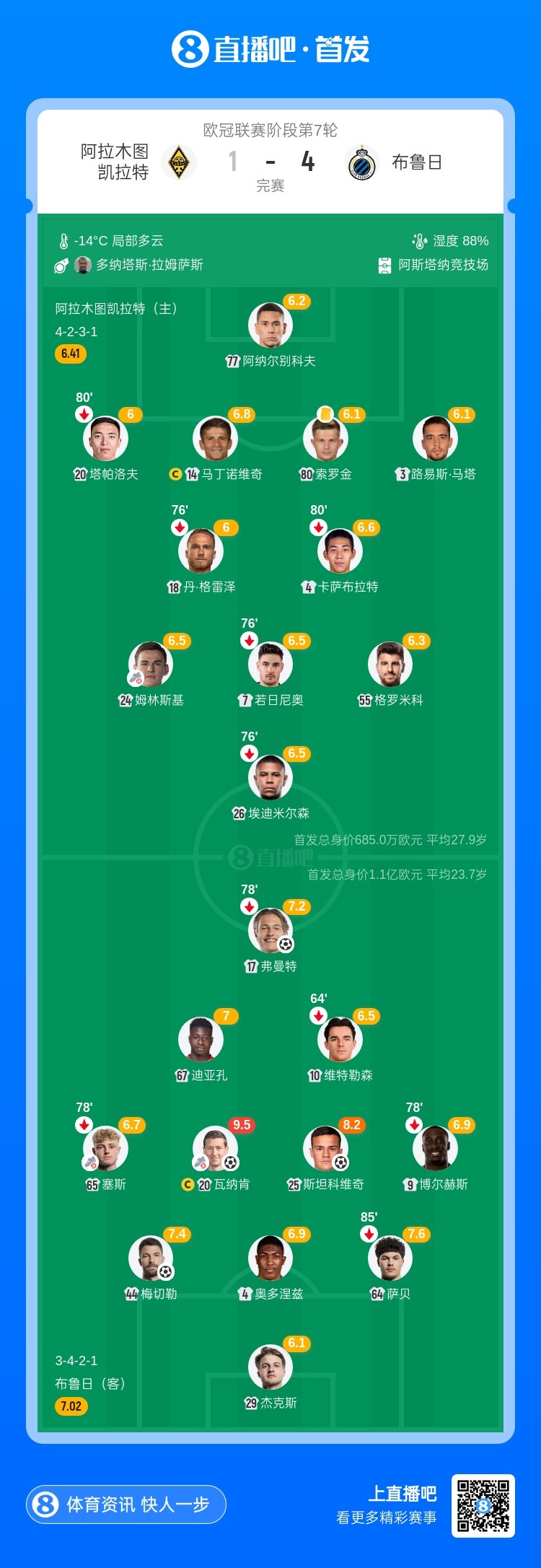 第74分钟,弗曼特门前包抄破门,布鲁日客场3-0领先阿拉木图凯拉特↓