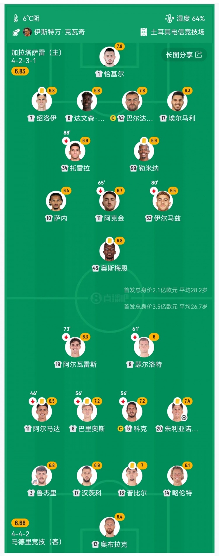 第45分钟,加拉塔萨雷右路下底横扫禁区,后点伊尔马兹绝佳机会打飞↓
